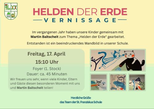 Am Freitag, 17. April kommt Martin Baltscheit zu uns an die Schule. Gemeinsam wollen wir das fantastische Wandbild, das in Zusammenarbeit mit den Kindern zum Thema Helden der Erde entstanden ist, feiern.